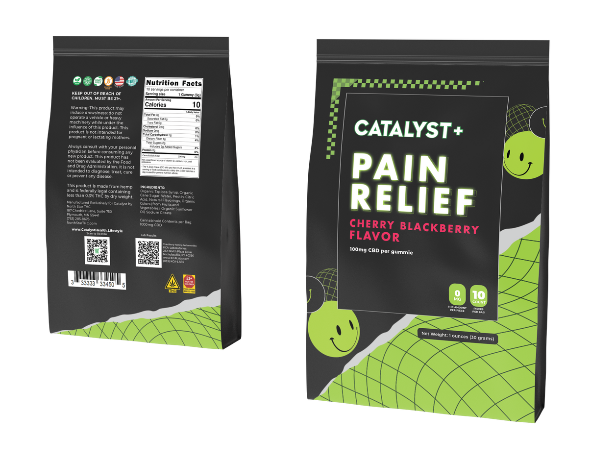 Discover fast-acting comfort with Catalyst+ Pain Relief Cherry Blackberry gummies. Bursting with fruity flavor, these 100mg CBD gummies are crafted to ease tension, reduce aches, and support relaxation — all with 0% THC. A delicious way to stay balanced and pain-free throughout your day.