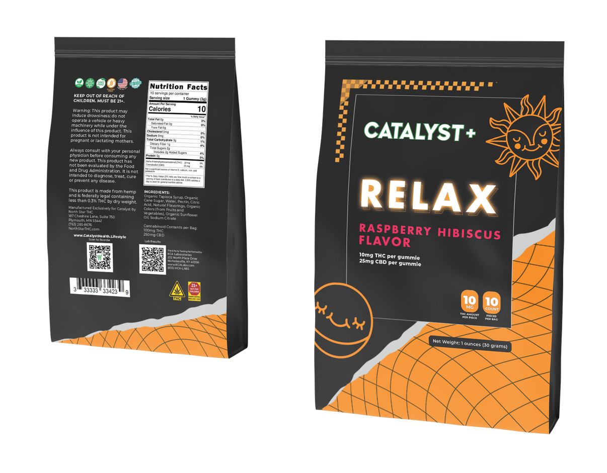 Find your calm with Catalyst+ Relax Raspberry Hibiscus gummies. Each gummy features 10mg THC and 25mg CBD for a balanced, soothing effect that helps ease tension and elevate your mood. Sweet, tart, and floral — the perfect flavor for your evening chill routine.