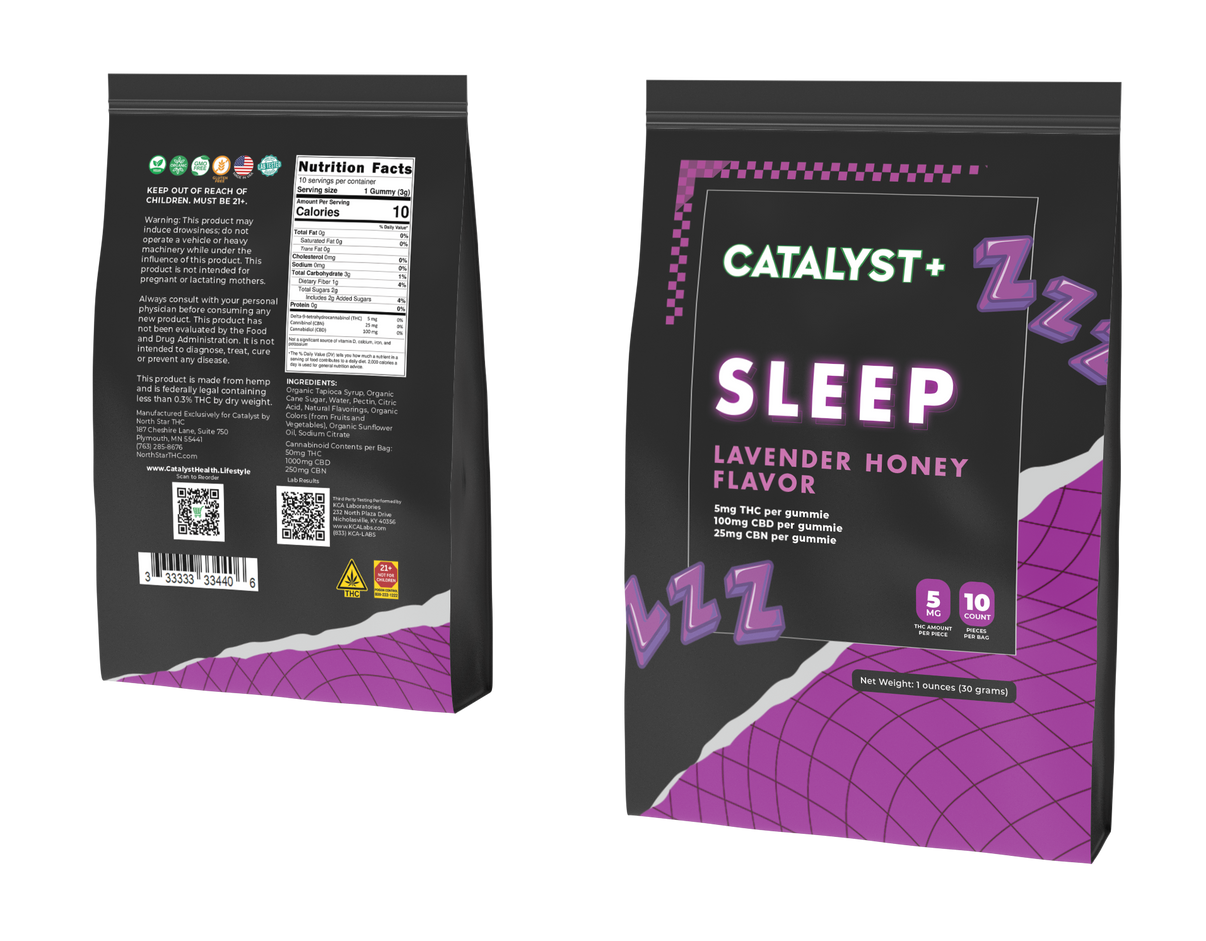 Unwind into restful sleep with Catalyst+ Sleep Lavender Honey gummies. Each serving combines 5mg THC, 100mg CBD, and 25mg CBN to help quiet your mind, relax your body, and support deep, restorative sleep. With soothing lavender honey flavor, it’s the perfect bedtime treat.