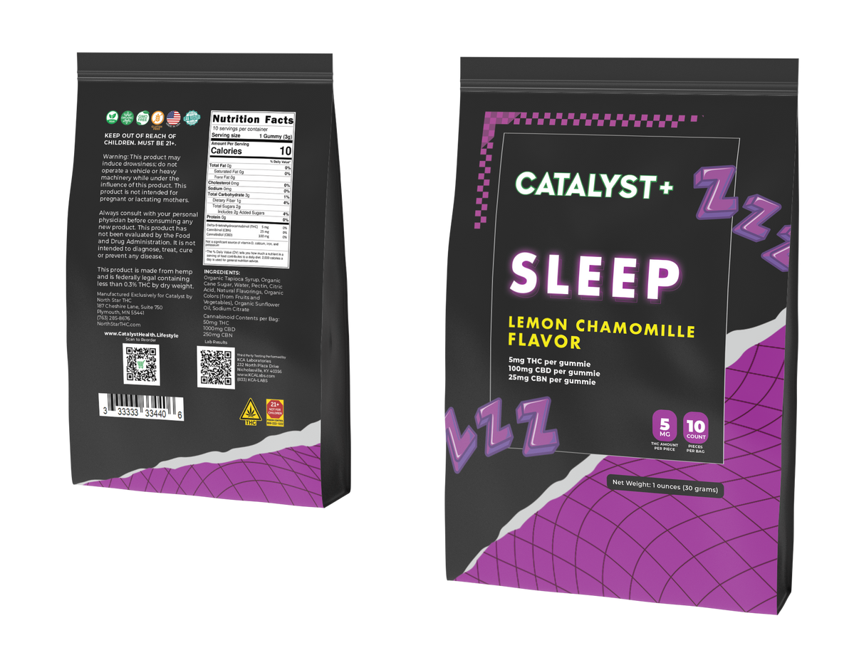 Drift off naturally with Catalyst+ Sleep Lemon Chamomile gummies. Infused with 5mg THC, 100mg CBD, and 25mg CBN, this calming blend works synergistically to support deeper, more restorative rest. The refreshing citrus-chamomile flavor makes bedtime something to look forward to.